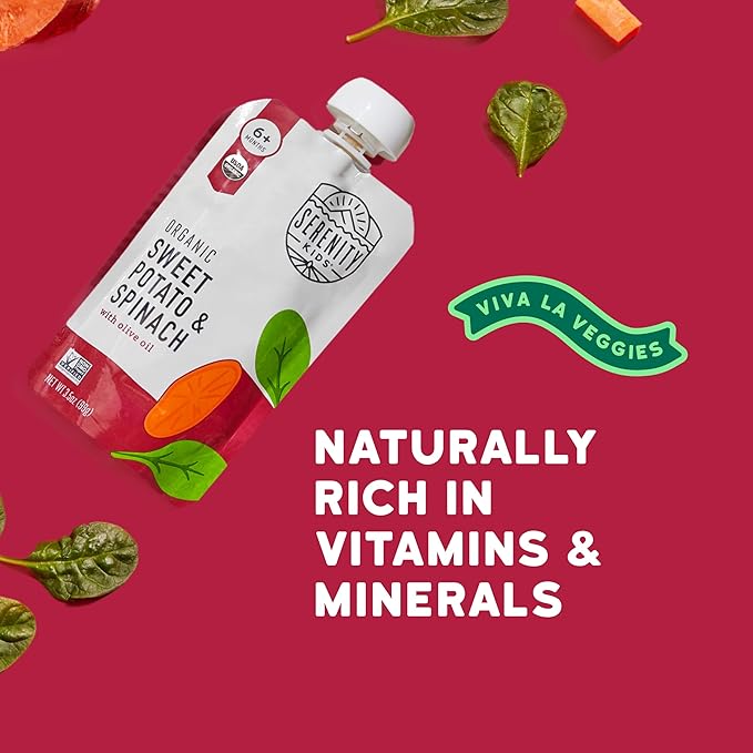 - Serenity Kids Power Pouch: Dive into a pack of 12 Serenity Kids organic baby food pouches with sweet potato and spinach puree. Packed with healthy fats from avocado oil, these baby pouches are perfect for your little one's fall baby puree adventure