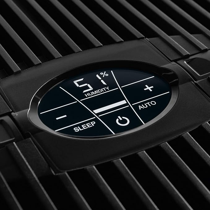 - The interactive touch display features an auto mode which allows you to preset a target relative humidity level, as well as a sleep mode which dims the screen and reduces the fan speed.