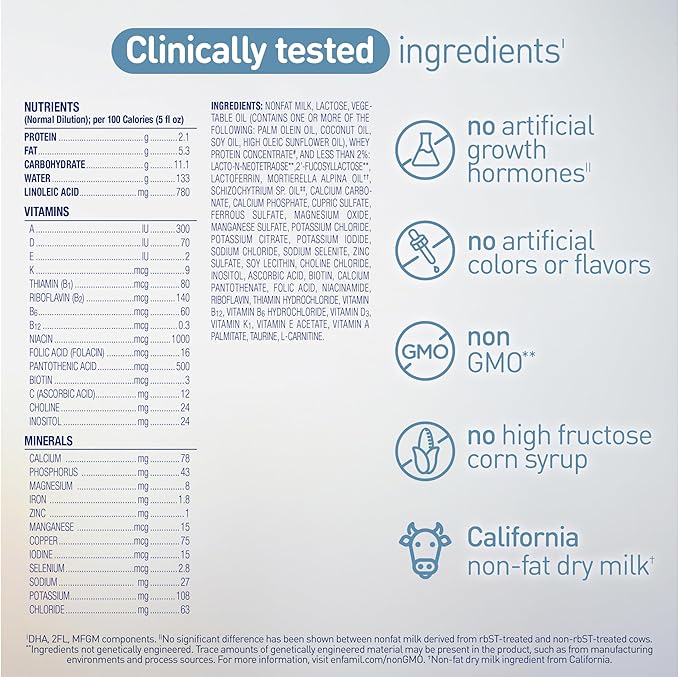 - NO ARTIFICIAL ADDITIVES & NON-GMO: Has clinically-tested, non-GMO ingredients. Free from artificial growth hormones, colors, and flavors. Enfamil Optimum does not contain high fructose corn syrup and is made with milk sourced from the United States. Optimum is premium baby formula for infants through 12 months of age.