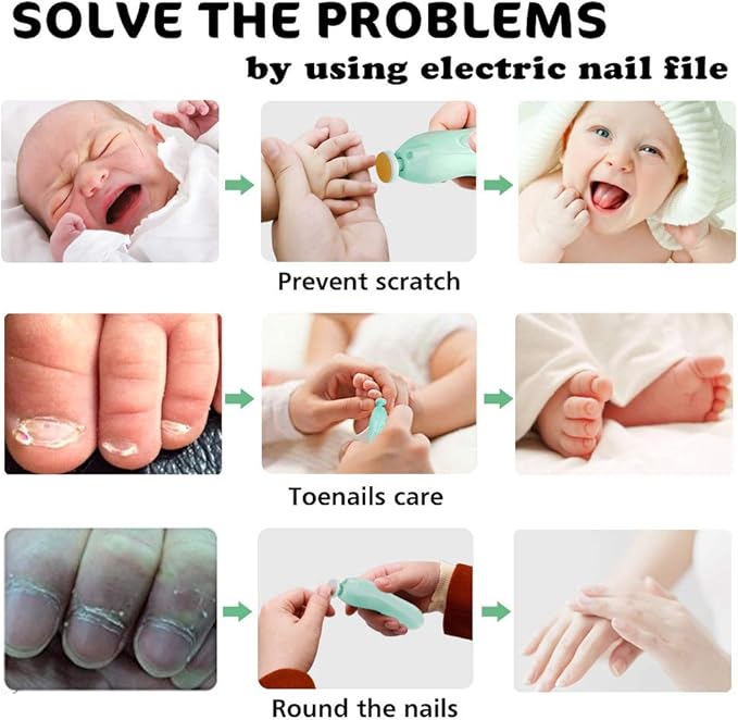 - NAIL CARE KIT FOR BABIES AND ADULTS - Better than others, this baby nail file set includes 1 nail clipper, 6 grinding heads and 12 extra sandpapers. Colored sandpapers with 3 textures are designed for different stages of babies' growth. Electric baby nail trimmer also comes with 1 cylindrical grinding head and 1 metal grinding head for adults, 1 soft grinding heads for polishing. The nail clippers can be used for newborn, infant, toddlers, kids from 0 to 12 months or above, as well as adults