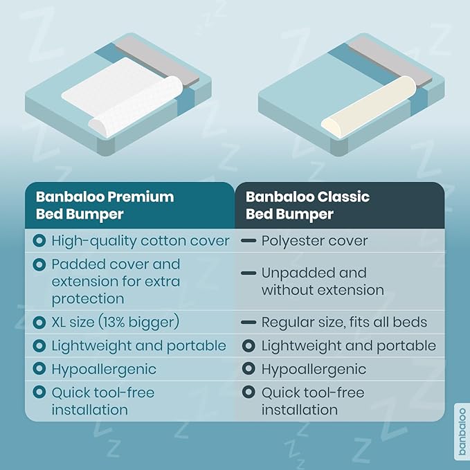 - SAFE: We made sure that the safety and protection of our Classic bed bumper were not compromised when designing our Premium bed barrier. It provides the same level of security to prevent your child from rolling out of bed in the middle of the night without disrupting their sleep. While rails make it feel like your child is in a cage, this comfortable bed barrier will make it feel like they’re being snuggled while being protected.