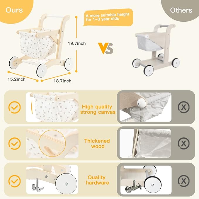 labebe Baby Push Walker Doll Stroller, Push Toy for Toddler, Shopping Cart for Girls and Boys 1 Years Old, Kids Stand Learning Walker, Wooden Play Wagon with Wheel, Larger Size 15.2 * 18.7 * 19.7
