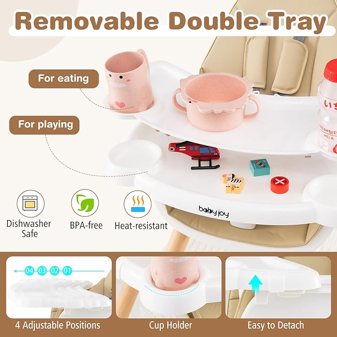- 4-Stage Adjustable & Detachable Tray: The removable tray makes the cleaning process a breeze. What you need to do is simply unlatch the convenient plate and move it to the sink for a thorough rinse. And 4 adjustable positions can provide more space for fast-growing children.
