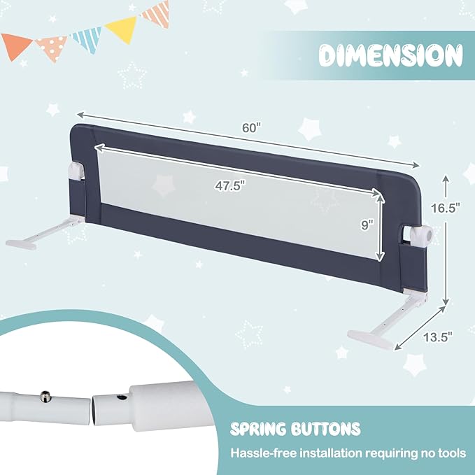 - Protect Your Baby's Safety: These 2 pack extra-long bed rails are 59 inches long each for added safety. Also When your kids sleep alone at night, they can provide them with the best protection and safe sleeping environment. They are your kid's safety guard, so you don't have to worry about your baby falling off the bed.