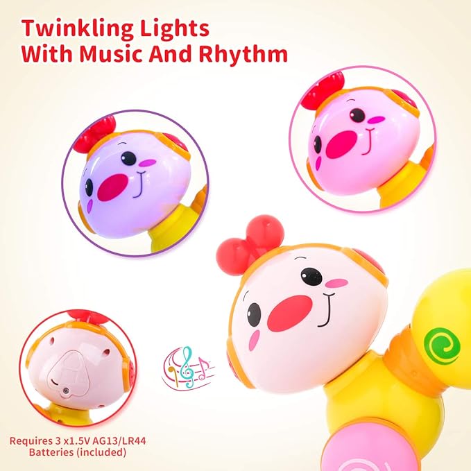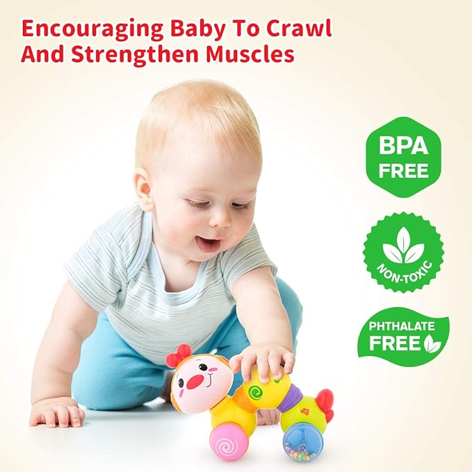 - ◕‿◕ ENCOURAGE CRAWLING TOY WITH MUSIC AND LIGHT: Vanmor baby musical toy adopts cute inchworm Styling and press and goes interactive design. There are soft lights and a variety of music while the caterpillar toys for babies 6 months is running, touch and go attract the babies to crawl to chase, climb and walking. It’s a development toy that encourages a newborn to learn and grow