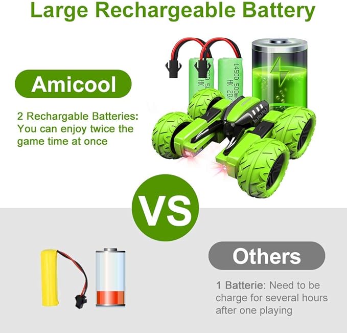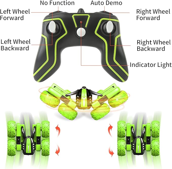 - 【Double Sided RC Stunt Car 360 Degree Spins & Flips】: Double sides running, Forward, reverse, left & right turn / retreat, left & right 360° spinning, fancy roll. Give you different playing experience with this toys for boys. Drift driving stunt needs skilled operation, gives daddy or mummy opportunity to play toy cars with your 3/4/5/6/7/8 years old girl or boy