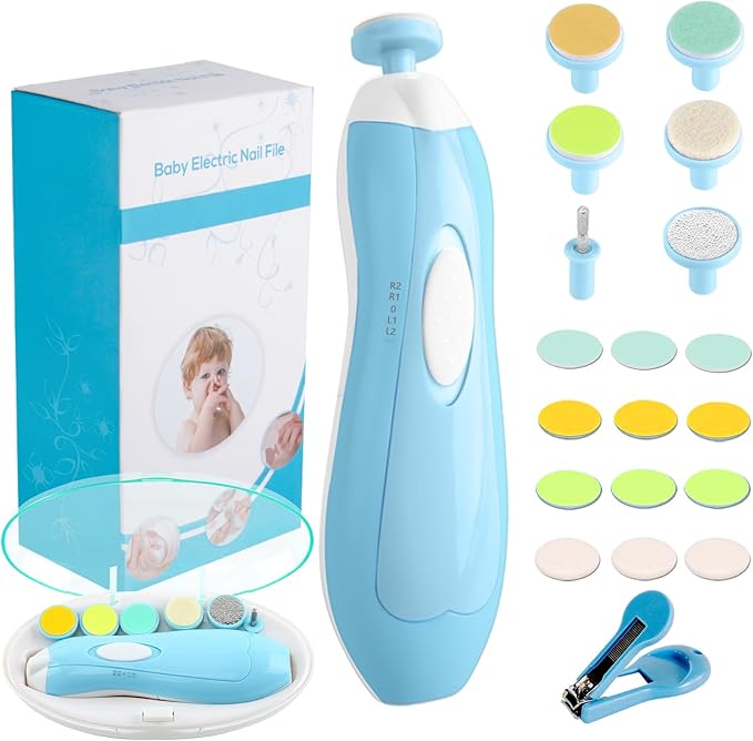 - NAIL CARE KIT FOR BABIES AND ADULTS - Better than others, this baby nail file set includes 1 nail clipper, 6 grinding heads and 12 extra sandpapers. Colored sandpapers with 3 textures are designed for different stages of babies' growth. Electric baby nail trimmer also comes with 1 cylindrical grinding head and 1 metal grinding head for adults, 1 soft grinding heads for polishing. The nail clippers can be used for newborn, infant, toddlers, kids from 0 to 12 months or above, as well as adults