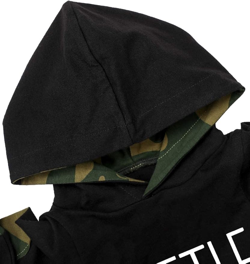 - 💖Design:Let your little one make a statement with this stylish baby boy's clothes set. The camouflage hooded top is printed with a 'little brother' monogram print, giving it a cool and stylish look. The army green camouflage pants also feature a "little brother" monogram print, adding a touch of uniqueness to the set. This outfit is perfect for your baby boy to make a statement while remaining comfortable and stylish.