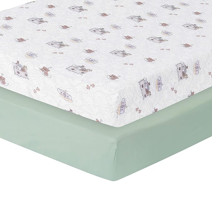 - SWEET SMILING ANIMALS TO CHEER YOUR BABY AND TODDLER: Precious Moments’ Noah’s Ark Print features baby animals, like giraffes and bear cubs on the Ark and playful in upside-down umbrellas! Use the solid green fitted sheet when the printed sheet is in the wash.
