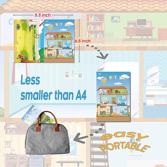 - Portable & Elegant: Opened, it provides 2 fun play scenes with a three-storey house, a sunshine garden and multiple objects, with which kids could exercise their imaginations for hours. Closed, it’s a thin pamphlet so kids could easily carry them around on trip, the magnets will stay on the board safely.
