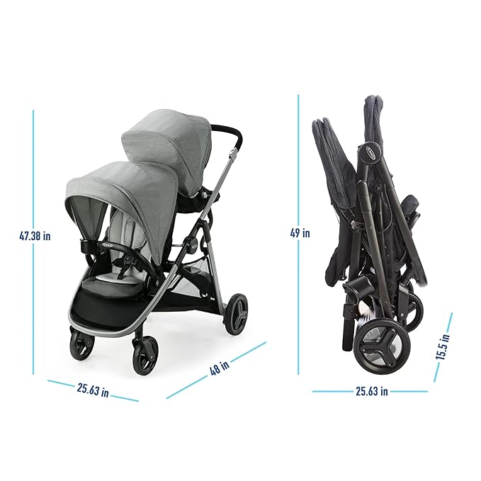 - Small-folding stroller rides like a double, but folds like a single stroller, making transport and storage easy