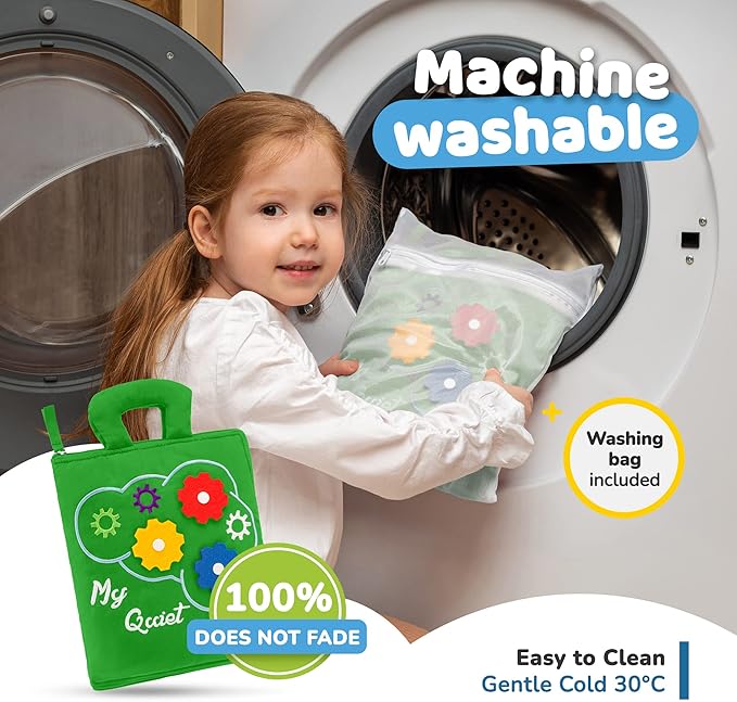 - Busy Board Book for Fine Motor Skills β This montessori toy for toddlers features 9 engaging activities designed to develop fine motor skills, including matching velcro shapes and colors, practicing buckles, telling time, and more. A fun and educational montessori busy board for 1 year old and up, it helps kids learn real-life skills through hands-on play.