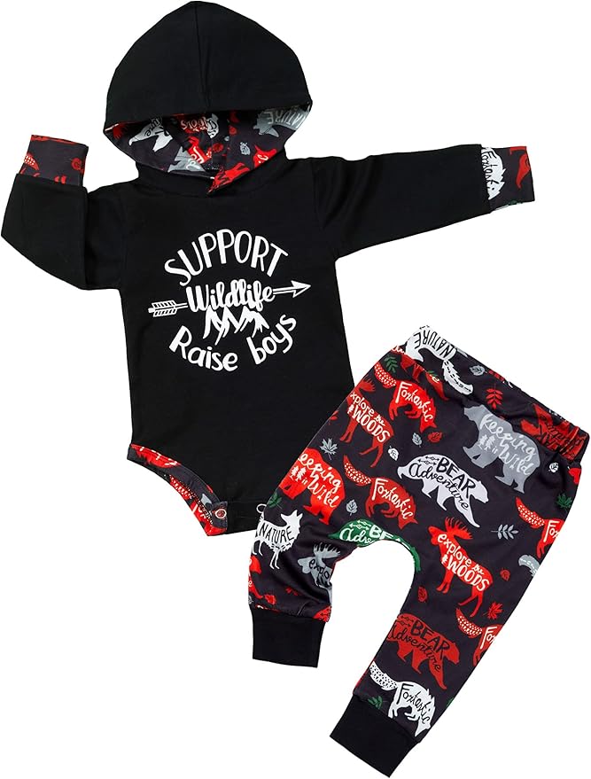 - Design:Let your little one make a statement with this stylish baby boy's clothes set. The black hooded top has a 'support wildlile raise boys' monogram print, giving it a cool and stylish look. The bear print pants add a touch of uniqueness to the outfit. This outfit is perfect for your baby boy to make a statement while remaining comfortable and stylish.