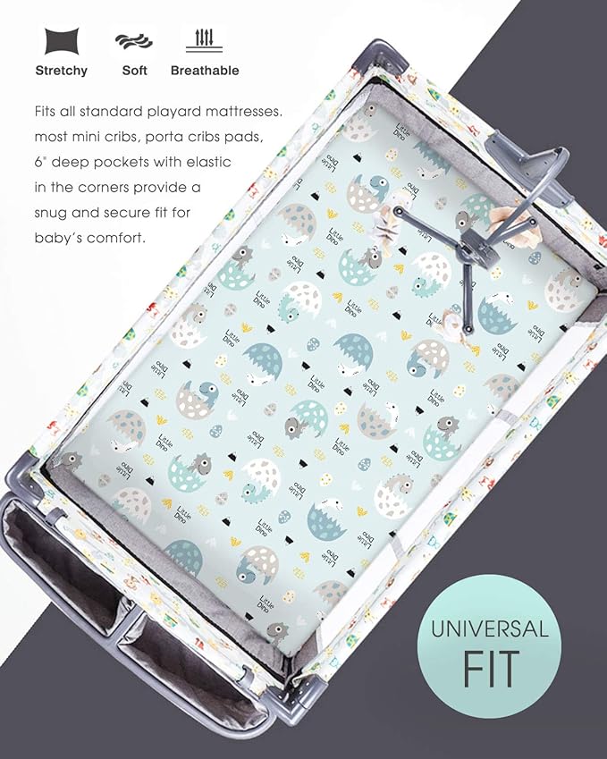 - Apple It Within Seconds: Thanks to the elastic bottom, our pack n play sheets come in a classic, cute dinosaurs and dinosaur eggs pattern that will put the finishing touches to any bedding. Make sure to give your darling a serene and calm bed to rest in.