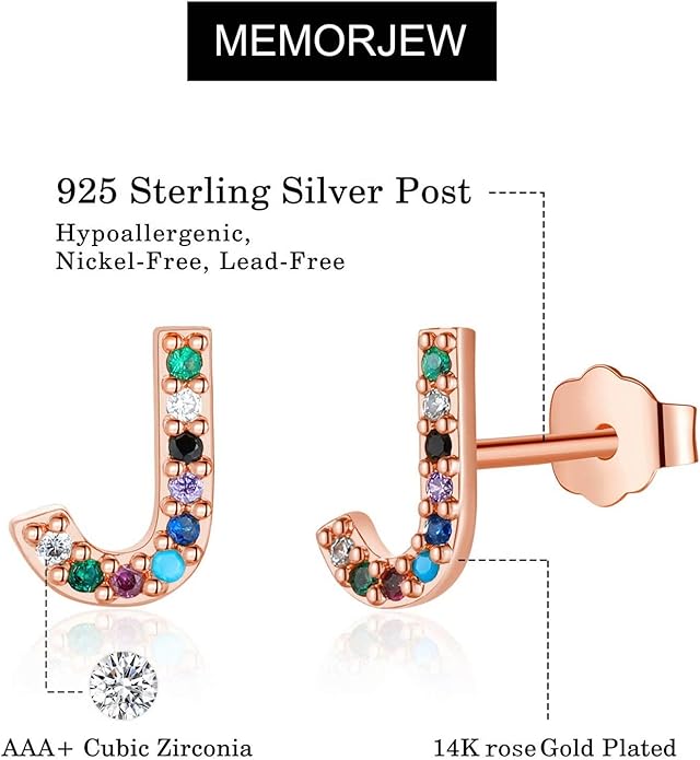 Memorjew Initial Stud Earrings for Women, Hypoallergenic 925 Sterling Silver Post Rainbow Cubic Zirconia Gold Plated 26 Initial Earrings for Women Jewelry Gifts