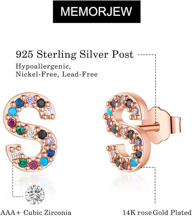 Memorjew Initial Stud Earrings for Women, Hypoallergenic 925 Sterling Silver Post Rainbow Cubic Zirconia Gold Plated 26 Initial Earrings for Women Jewelry Gifts