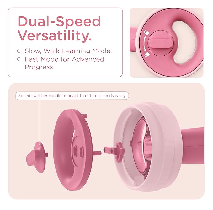 - Adjustable Speed - This baby walker with wheels has a two-speed control switch on the rear wheels to grow with the babies' steps, and the rear wheels applied antislip strips increase friction with the ground, avoiding "overspeed" or "out of control".