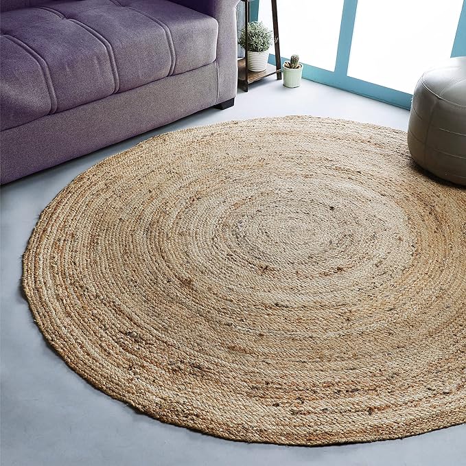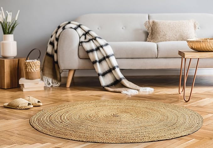 Hausattire Hand Woven Jute Braided Rug, 4’ Round – Natural, Reversible Boho Entry Area Rugs for Kitchen, Living Room I Farmhouse Decorative Floor Rug, 4 Feet Round