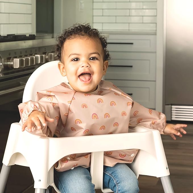 - TRAVEL BUDDY:The must-have baby feeding essentials for on-the-go parents! Our long sleeve waterproof smock bib (fits 6-24 months) is a versatile wipeable bibs with scratch-free closures and 360 degrees puree-proof protection.This bib with sleeves is perfect for plane or car meals, It folds flat in diaper bags,handles baby-led weaning messes and makes a great gender-neutral baby shower gift.Ideal for parents needing baby eating essentials on the go.