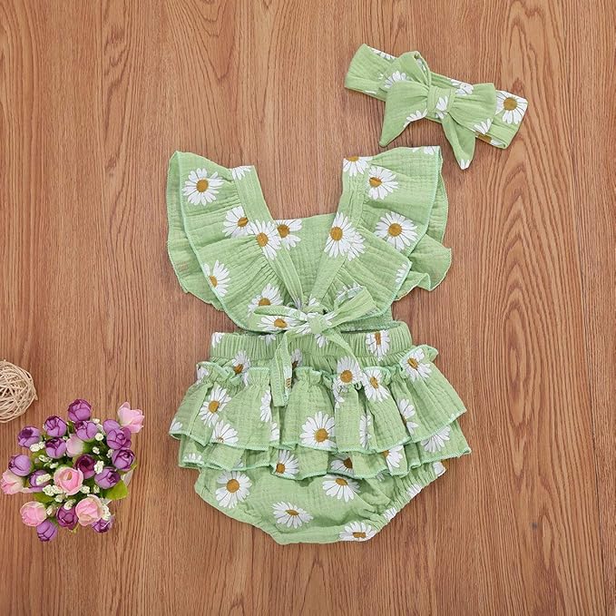 - ☪Features--- Baby girl leeveless ruffled square-necked one-piece romper,Daisy pattern, layered skirt, bottom snap design, easy to put on and take off and change diapers, and bow hairband, lovely appearance.