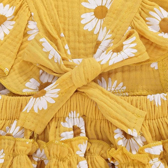 - ☪Features--- Baby girl leeveless ruffled square-necked one-piece romper,Daisy pattern, layered skirt, bottom snap design, easy to put on and take off and change diapers, and bow hairband, lovely appearance.