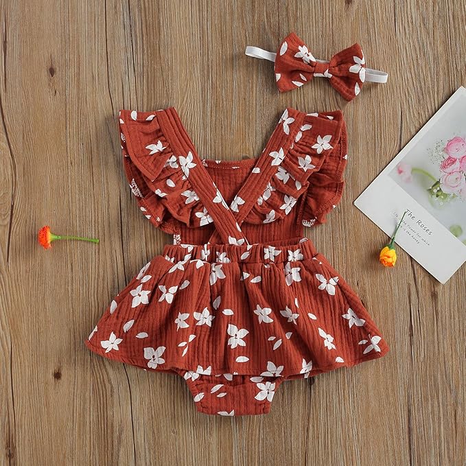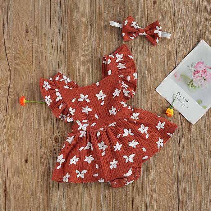 • ☪Features--- Baby girl leeveless ruffled square-necked one-piece romper,Daisy pattern, layered skirt, bottom snap design, easy to put on and take off and change diapers, and bow hairband, lovely appearance.