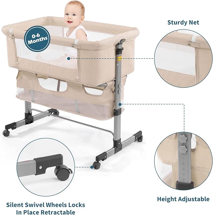 3in1 Bedside Crib for Girl or Boy, Bedside Sleeper for Baby Portable and Adjustable Crib with Mosquito net for Newborn Baby,Deep Khaki