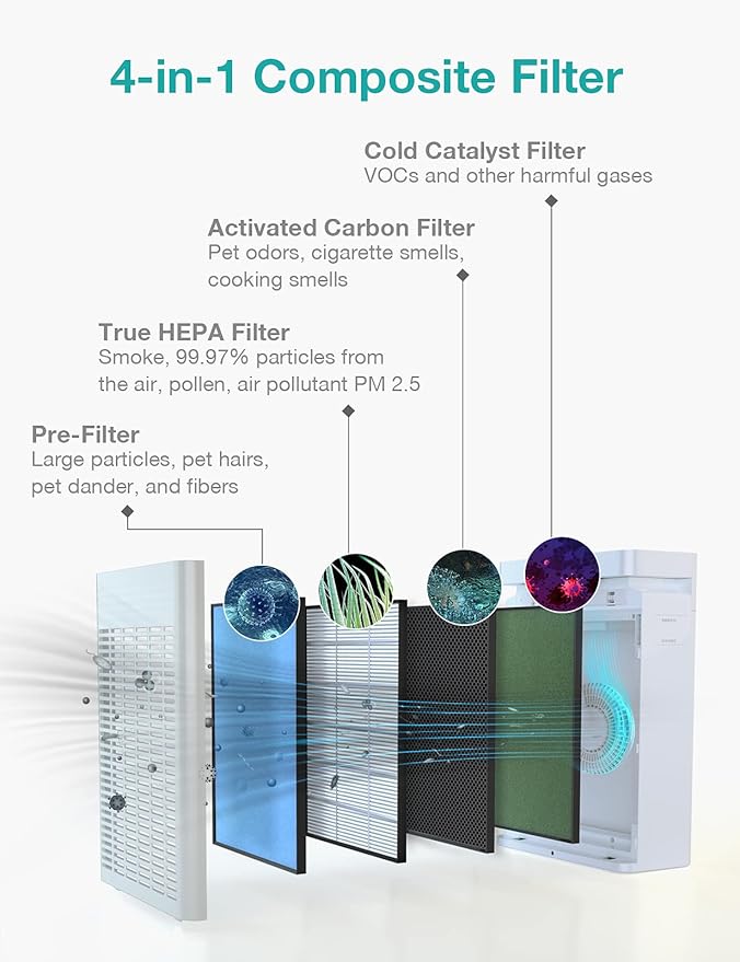 - True H13 HEPA Filter: Captures and reduces up to 99.97% of contaminants as small as 0.3 microns, including allergens, fine dust, pet dander, pet hair, pollen, mold spores, cigarette smoke, odors, and VOC's