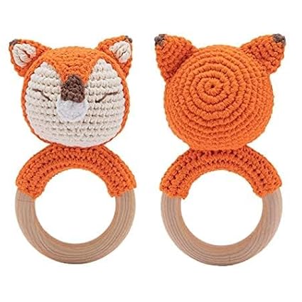 Wooden Baby Rattle Crochet Fox Baby Toys Handmade Newborn Toy Early Development Grips Stuffed Animal Organic Rattle