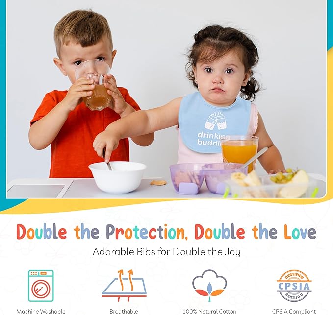 100% Cotton Drinking Buddies Twin Bibs Cute & Practical Unisex Bibs for Twins with Waterproof, Durable, for Everyday Use