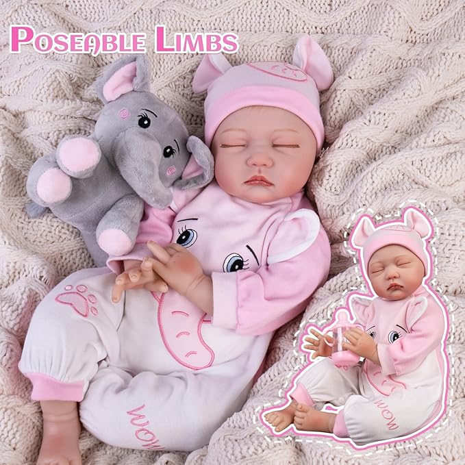 - EXQUISITE GIFT SET: Make your beloveds a joyful experience with our weighted reborn baby doll.This cute newborn baby girl will come to your home with a nice gift box containing all complimentary accessories which will creat a lot of fun.The following items will be delivered:Reborn doll*1,Elephant jumpsuit*1(just like the picture),Pink hat*1,Plush elephant*1,Magnet pacifier*1,Feeding Bottle*1,Birth certificate*1,Service Card*1.
