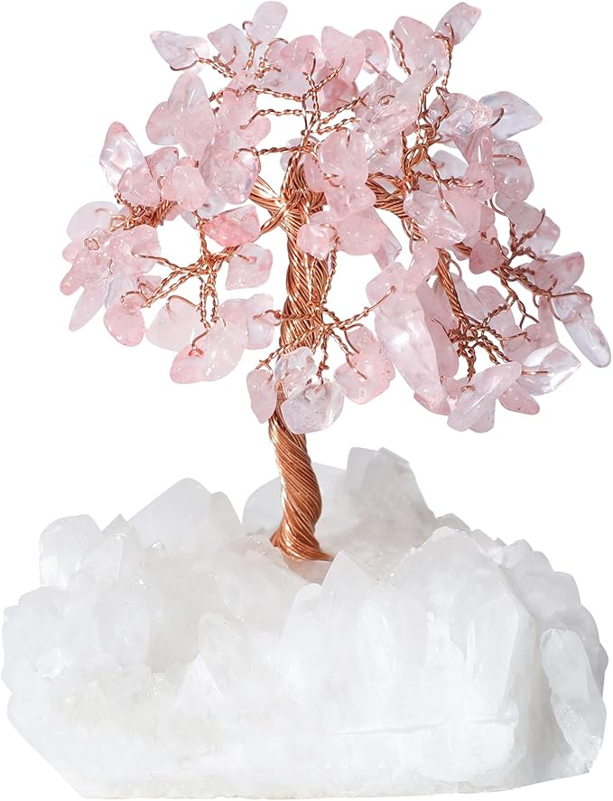 - β¨ ROSE QUARTZ GEMSTONE MONEY TREE: This Feng Shui Rose Quartz Gemstone Tree with White Aura base (Copper Wire) Size: 6-7 Inch Handmade In India. This luck tree brings strength and clarity to the intellect, aids concentration & memory retention, cleanses the emotional aspects, spreads compassion and potentiated with cosmic vibes, Something simply beautiful like a gemstone tree can create a space where positivity can freely flow and also attract good things.