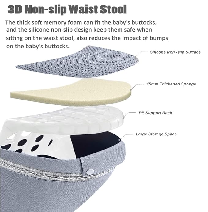 - Ergonomic Hip Seat: The waist stool maintains the baby's M-shape during carrying, helping their skeletal development. The wide waistband make the hip seat to fit snugly against the parent's waist, helping to share the weight during carrying baby. The inward sloping angle of the hip seat keeps the baby close to the parent's body comfortably and reduces bumps and shaking when parents walking. Besides, it make baby feel safety in their arms.