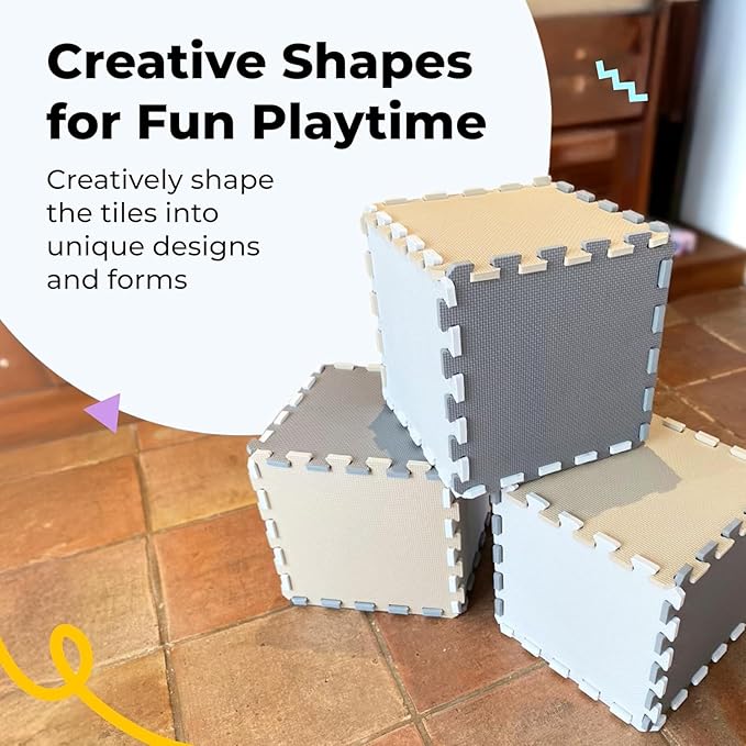 - π΄ EASY-TO-ASSEMBLE INTERLOCKING FOAM TILES: Our 12.4 x 12.4-inch interlocking foam tiles fit securely together, creating a customised play area for any room. Choose from our 16-piece set (covers 16 sq ft) or 36-piece set (covers 36 sq ft), each with matching borders for a polished look.