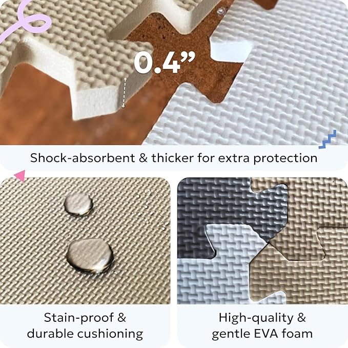 - π§ NON-TOXIC, SOFT & WATERPROOF PLAY MAT: Made from durable EVA foam, this soft play mat is 0.4 inches thick for comfort and safety. Its waterproof surface wipes clean easily, keeping your childβs play area hygienic and ready for daily use.