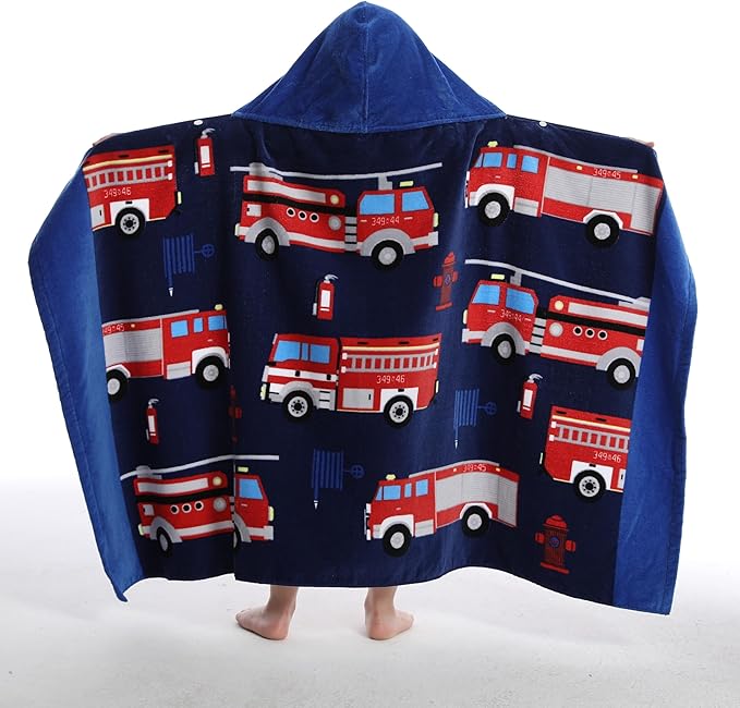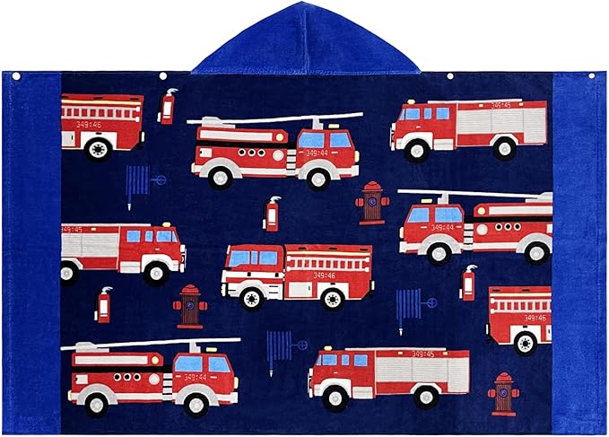 BANGSAUR Kids Hooded Beach Towels, 100% Cotton 50x30 inches Bath Pool Towel Wrap, Toddlers Boys 3-12 Years Coverup Fire Truck