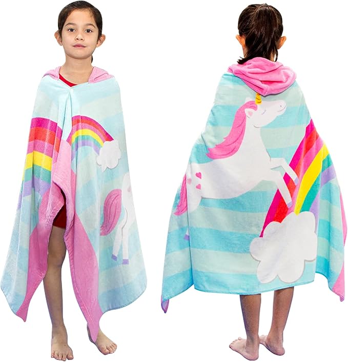 BANGSAUR Kids Hooded Beach Towels, 100% Cotton 50x30 inches Bath Pool Swiming Towel Wrap, Toddlers Girls 3-12 Years Coverup Rainbow Unicorn