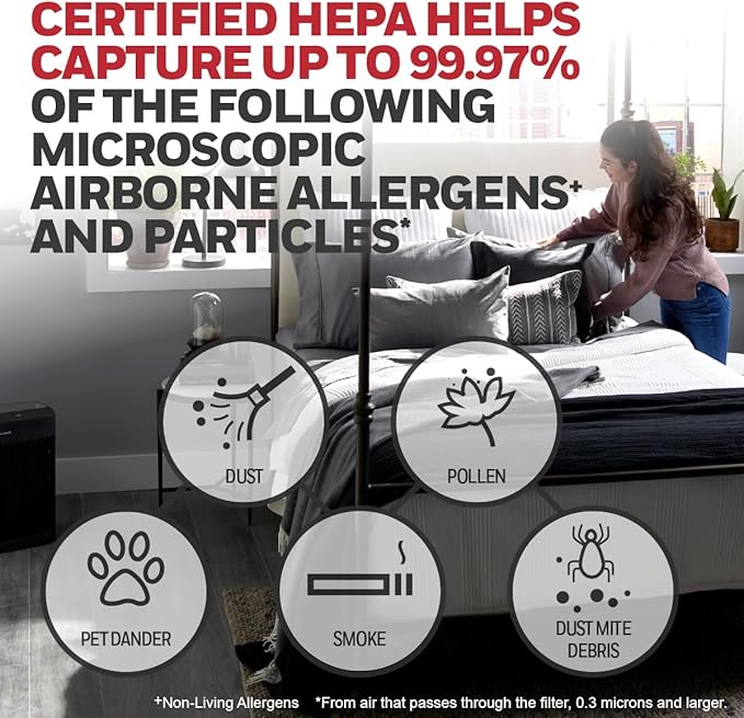 - Exceeds HEPA standards*: Advanced HEPA filtration captures over 99.99% of airborne dust, pollen, pet dander and smoke** This powerful air purifier refreshes the air at least once an hour in rooms up to 2400 sq. ft. to provide cleaner, fresher air