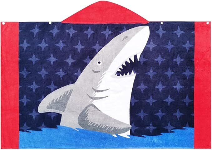 BANGSAUR Kids Hooded Beach Bath Towels, 100% Cotton 50"x30" Wrap Blanket, Toddlers Boys 3-12 Years Coverup Towel White Shark
