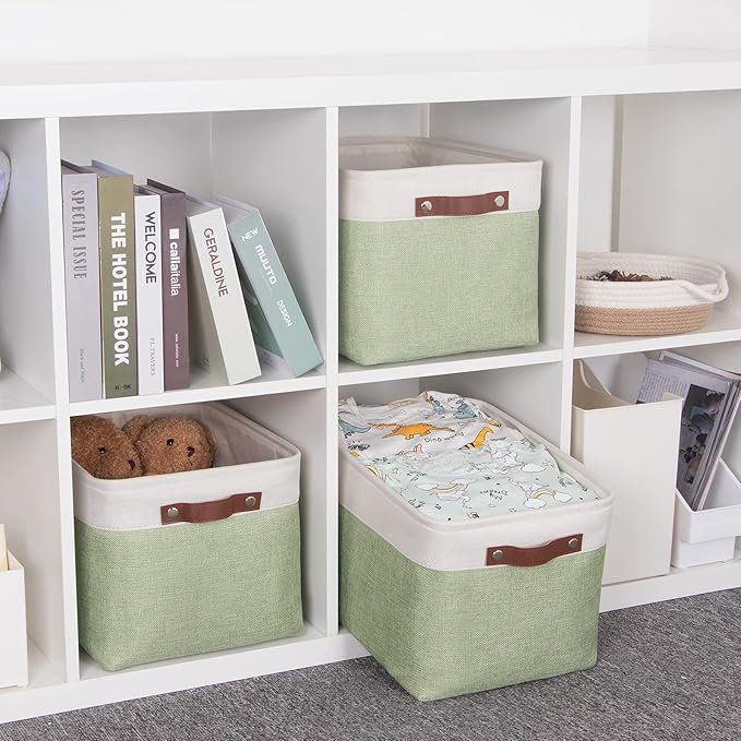 HNZIGE Storage Basket for Organizing Clothes(3 Pack) Decorative Storage Bins for Shelves Toys, Fabric Canvas Bins Storage Organizer with Handles(Gray&Green,15" X 11" X 9.5")