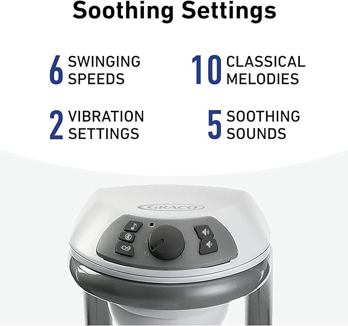 - 6 swinging speeds allow you to find the right pace; 2-speed vibration helps to soothe baby; 10 classic melodies and 5 nature sounds to delight and amuse; Mobile with 3 soft toys keeps baby entertained