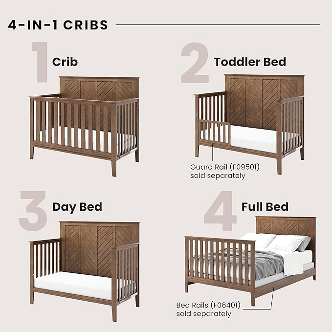 - Grows With Your Baby: This 4-in-1 Convertible crib grows with your child by converting into a crib, day bed, toddler bed (toddler guard rail conversion kit separately) and a full-size bed with the addition of coordinating bed rails sold separately (Guard Rail: F09501.xx) (Bed Rails: F06401.xx)