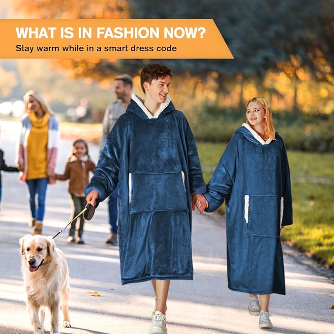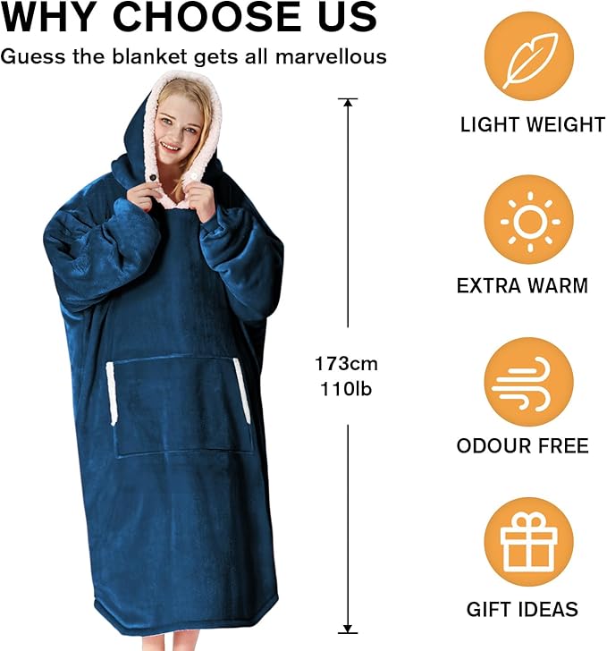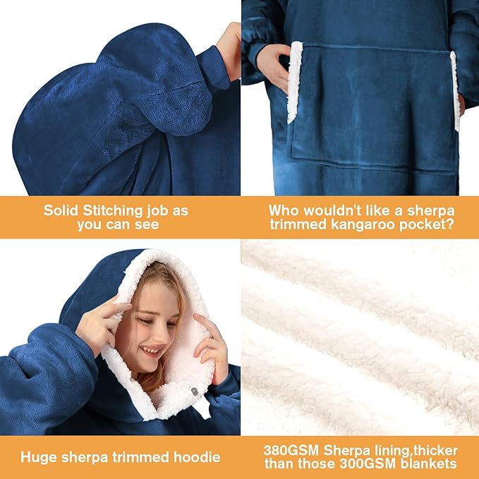 yescool Wearable Blanket Hoodie, Flannel Sherpa Fleece Blanket Sweatshirt for Adults Women Men, Big Plush Cozy Hooded Blanket with Hood, Pocket & Sleeves, Large, One Size Fits All (Navy Blue)