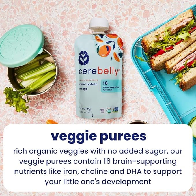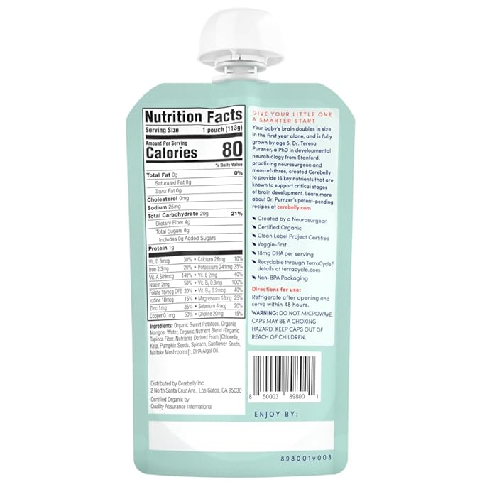 - BRAIN SUPPORTING NUTRIENTS - Cerebelly baby pouches are the only organic fruit and veggie pouch that delivers 16 brain-supporting nutrients that play a pivotal role in your child's cognitive development. With 35% of their daily value of Potassium, 20% daily value of Iron and 30% daily value of Vitamin D, these pouches pack a punch!