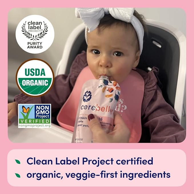 - BRAIN SUPPORTING NUTRIENTS - Cerebelly baby puree pouches are the only organic fruit and veggie pouch that delivers 16 brain-supporting nutrients that play a pivotal role in your child's cognitive development. With 35% of their daily value of Zinc, 25% daily value of Iron and 80% daily value of Vitamin A, these pouches pack a punch!