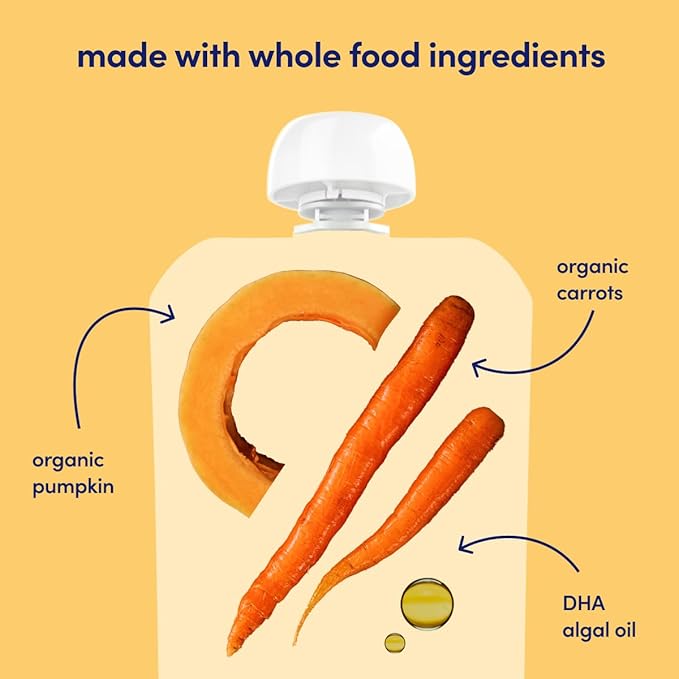 - VEGGIE FIRST, ORGANIC INGREDIENTS - Our BPA-free and Non-GMO organic baby pouches are crafted from whole foods including bright, crisp carrots and sweet pumpkin! No added sugars, preservatives, gluten, dairy or nuts; our organic fruit and vegetable pouches give your baby what their brain and body needs, right from the start.