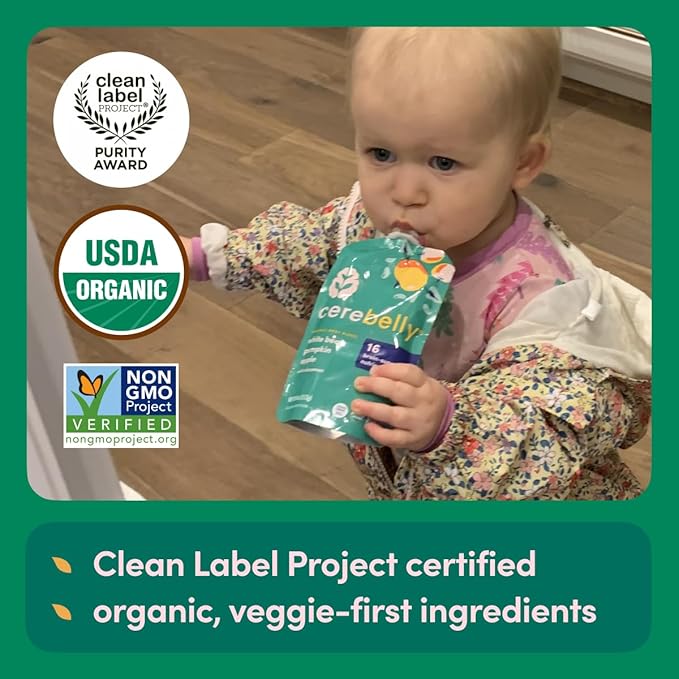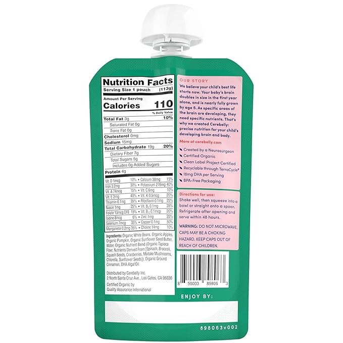 - ORGANIC BABY & TODDLER FOOD POUCHES - Our White Bean Pumpkin Apple baby food pouches were created by a devoted mother who is also a neurosurgeon and a doctor in developmental neurobiology. After years of trial and error, she developed the perfect baby squeeze pouches made with whole, organic ingredients and backed by scientific nutritional studies. Cerebelly's toddler and baby food puree pouches are the best meal or snack for your child’s growing brain.