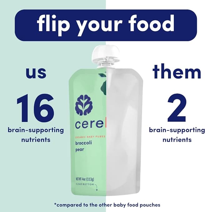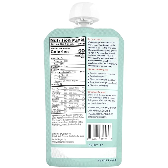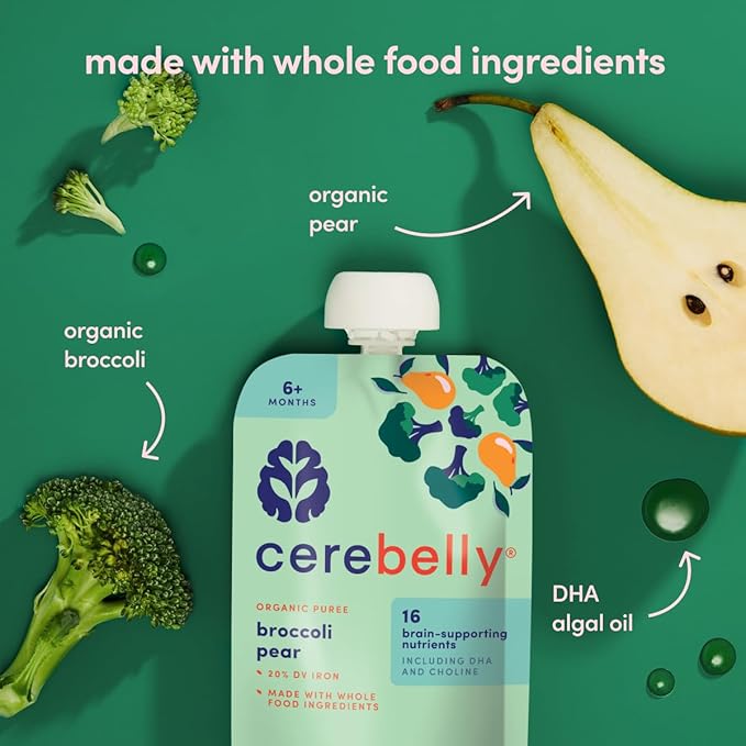 - ORGANIC BABY & TODDLER FOOD POUCHES - Our Broccoli Pear baby food pouches were created by a devoted mother who is also a neurosurgeon and a doctor in developmental neurobiology. After years of trial and error, she developed the perfect baby squeeze pouches made with whole, organic ingredients and backed by scientific nutritional studies. Cerebelly's toddler and baby food puree pouches are the best meal or snack for your child’s growing brain.