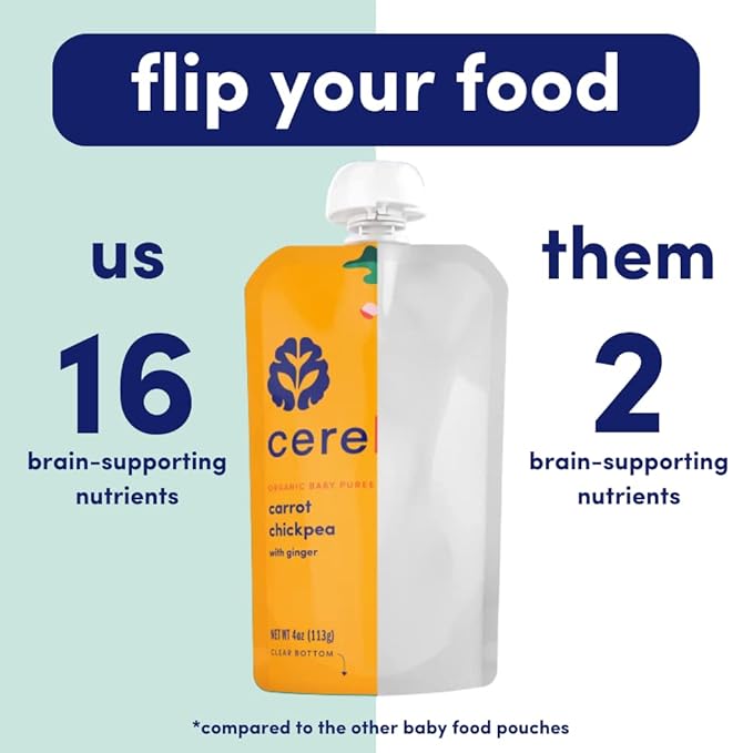 - ORGANIC BABY & TODDLER FOOD POUCHES - Our Carrot Chickpea baby food pouches were created by a devoted mother who is also a neurosurgeon and a doctor in developmental neurobiology. After years of trial and error, she developed the perfect baby squeeze pouches made with whole, organic ingredients and backed by scientific nutritional studies. Cerebelly's toddler and baby food puree pouches are the best meal or snack for your child’s growing brain.