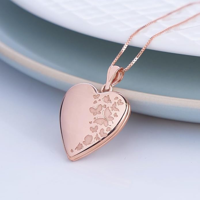 - Personalized Heart Locket - The Front of the Heart Shaped Locket Is Engraved with ‘Butterflies’ You Can Engrave a Message on the Back. Choose a Favorite Photo and Create the Perfect Gift. Click “Customize Now” to Design Your Custom Locket Necklace. Rose Gold, Locket + 1 Photo + Engraving.